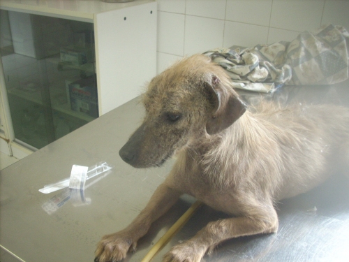 Lui è MAURIZIO........ piccolo cagnetto sfortunato...... è affetto da leishmaniosi, che l'ha fortemente invalidato!!!!!! è pelle ed ossa ed ha il corpo ed il musetto senza peli, con croste ed un'intensa desquamazione della cute.