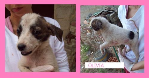 OLIVIA: sorellina di poldo. E' una femminuccia, 50 giorni, taglia piccola sicuramente, forse è stata l'ultima della cucciolata ed è rimasta piccola piccola! E' molto agile e sveglia.La dolcezza dei suo occhi è senza fine. Ha ricevuto gli stessi trattamenti di poldo: vermifugo e antiparassitario. Aveva un'infestazione intestinale molto forte. Ha delle zone di alopecia: non è rogna nè micosi.Forse sono ciò che resta di numerose ferite avuta da neonata..non sappiamo se ricrescerà il pelo in queste zone..questo è un grande problema purtroppo perchè la gente difficilmente adotta cani o cuccioli con difetti estetitci seppur sanissimi! lei potrà interessare solo veri amanti degli animali..povera piccola già mi piange il cuore a pensare che tutti la ignoreranno per uno stupido difetto estetico..