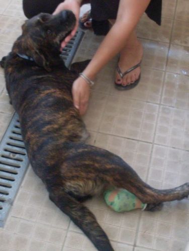 Pitta e' una giovanissima incrocio Pitt portata da una volontaria alla Asl dell'Aquila ricoperta da ferite ancora aperte, probabilmente assalita da altri cani e non penso neanche che abbia reagito perche' e' troppo buona, chi mi conosce sa che io ho un po' di timore per i molossoidi ....non ci posso fare niente ...quindi quando mi si presentano vado sempre un po titubante prima di accarezzali....ma quando e' arrivata lei e' bastato solo lo sguardo sofferente che aveva.....con la pelle a brandelli...e la patatina quasi staccata.... l'hanno messa sul tavolo per ricucirla...prima le hanno messo la museruola....ma visto che non reagiva l'ho tolta e ho tenuto la sua testona tra le mie mani e ho cominciato ad accarezzarla .... beh....mentre il Dottore la ricuciva lei mi scodinzolava..... e che ve lo dico a fare me ne sono subito innamorata....vi giuro che non ha fatto un fiato..... ora praticamente e' guarita..ha una piccola feritina rimasta sulla zampetta ma sta andando via pian piano ....