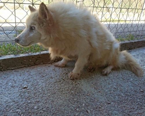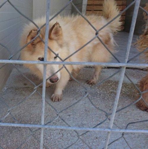 MOLISE- ADOTTABILE NORD E CENTRO ITALIA Questo cagnolino cieco di 13 anni, volpino bianco, è in canile da 10 lunghi anni ormai. E’ in un canile del Molise dove i volontari possono accedere poche volte … cammina in tondo nella sua piccola gabbia, e sbatte il musetto dappertutto….! Lo abbiamo chiamato Nonno Miele per via della sua situazione, fa una tenerezza e una pena infinita. Miele 10 anni fa era già cieco e da 10 anni viene tenuto chiuso in un box piastrellato e di cemento di circa 5 metri per 5, senza verde. Da qui non lo fanno uscire mai, neanche per sgambare. Da 10 anni Miele non esce da qui. Quando cammina essendo cieco e per il poco spazio sbatte il musetto contro le grate. Miele pesa circa 14 kg, questo è il primo appello per lui, ha 13 anni e 10 anni di una prigionia terribile.